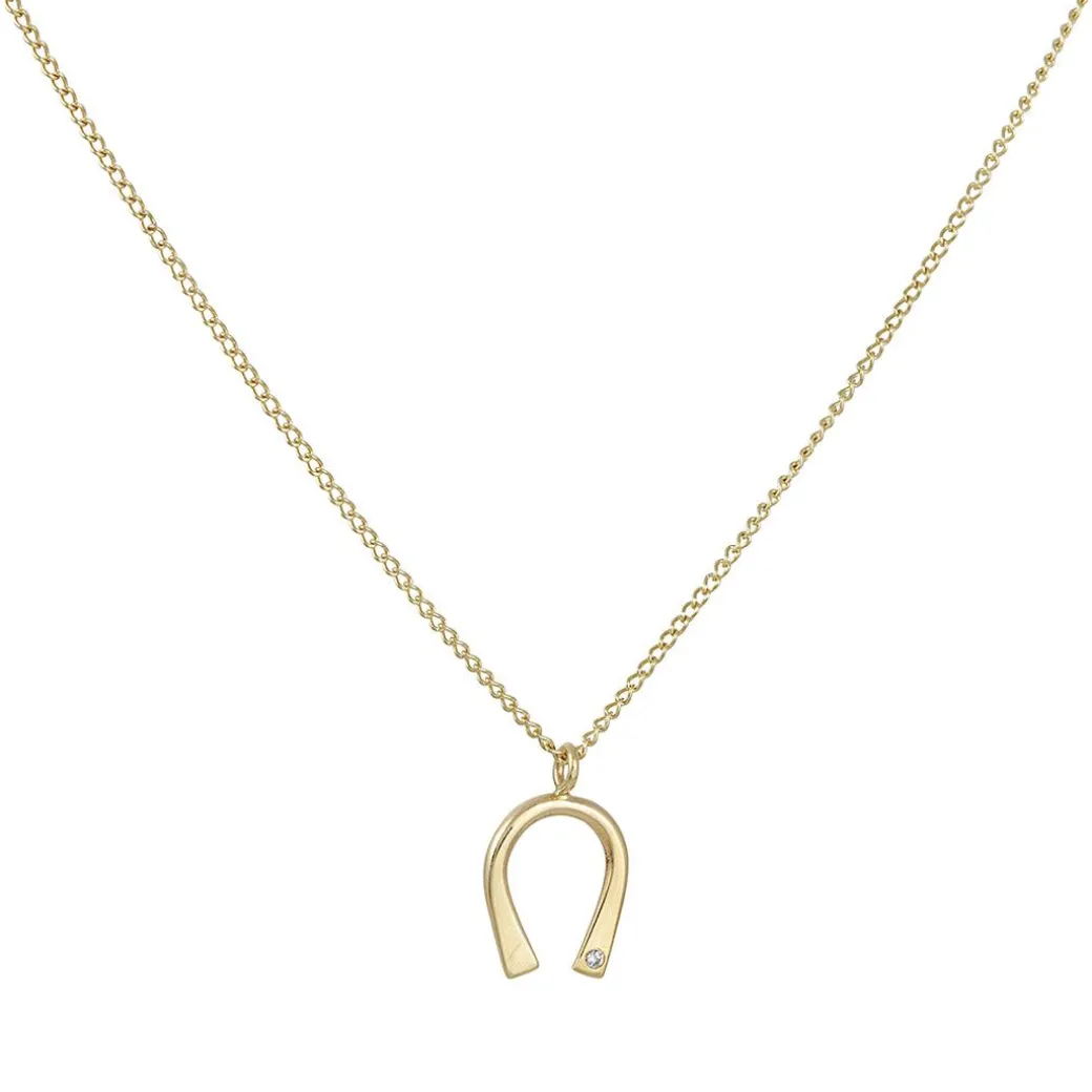 This lucky necklace features a small horseshoe pendant. It is enhanced with a single tiny round white diamond to add the perfect amount of sparkle.