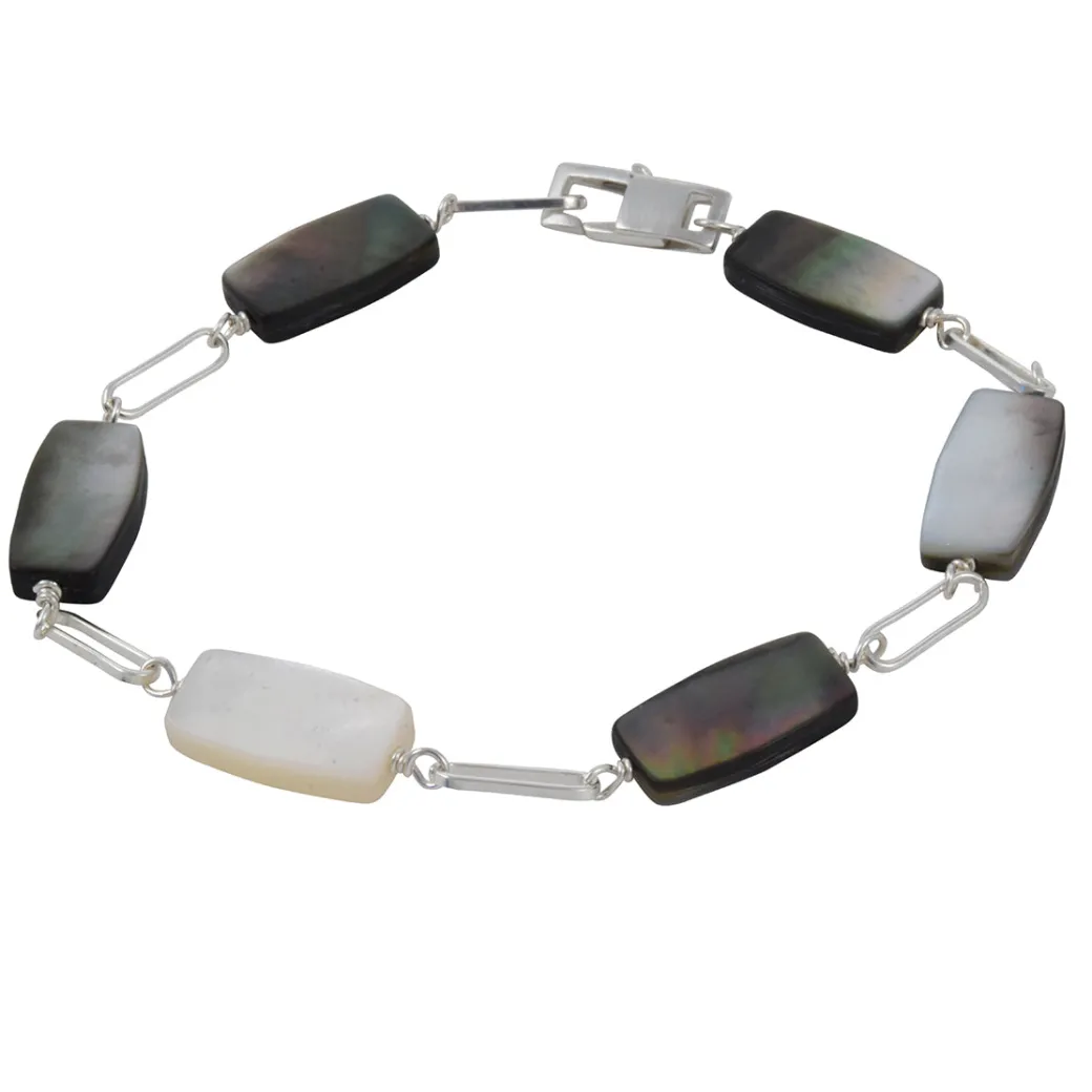 This lovely grey mother of pear bead bracelet interspersed with sterling silver paperchain links. Handcrafted in Philippa’s studio in Oakland, CA.