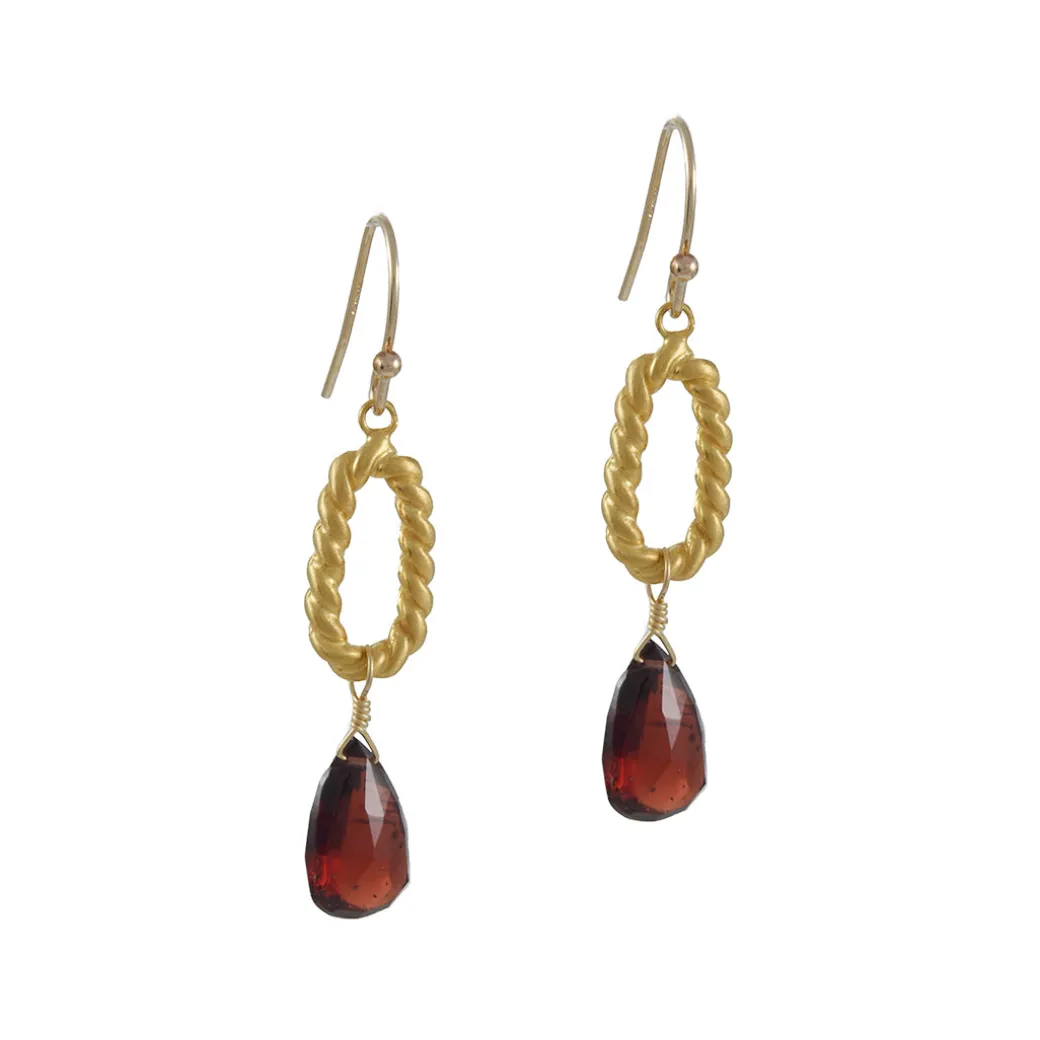 These earrings feature an organically shaped twisted open oval on top of a garnet drop. Hand-made in Phillipa’s Oakland CA studio.