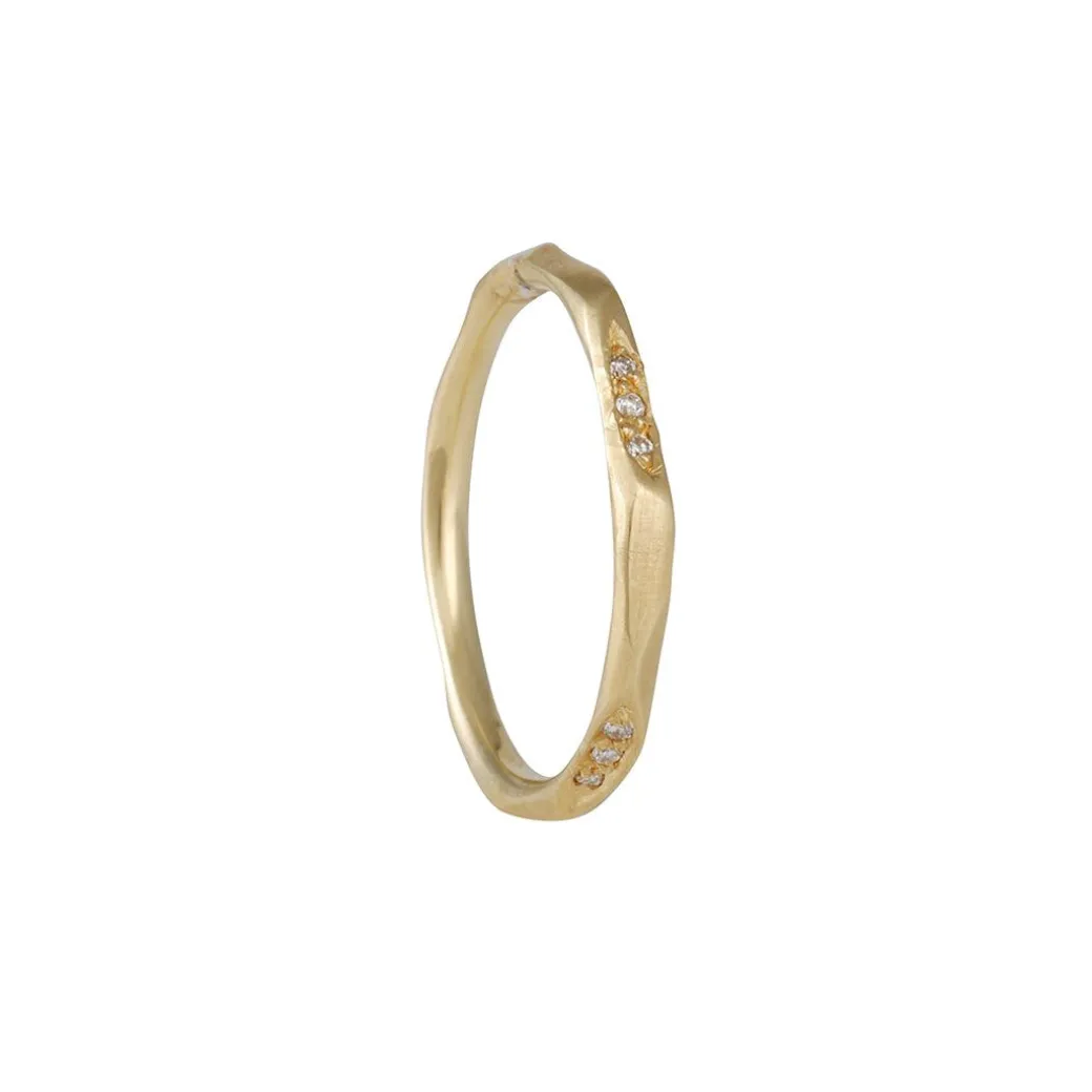A simple and delicate design, from Rebecca Overmann, this wedding band has small sections of pave set diamonds on an organically hand forged band.