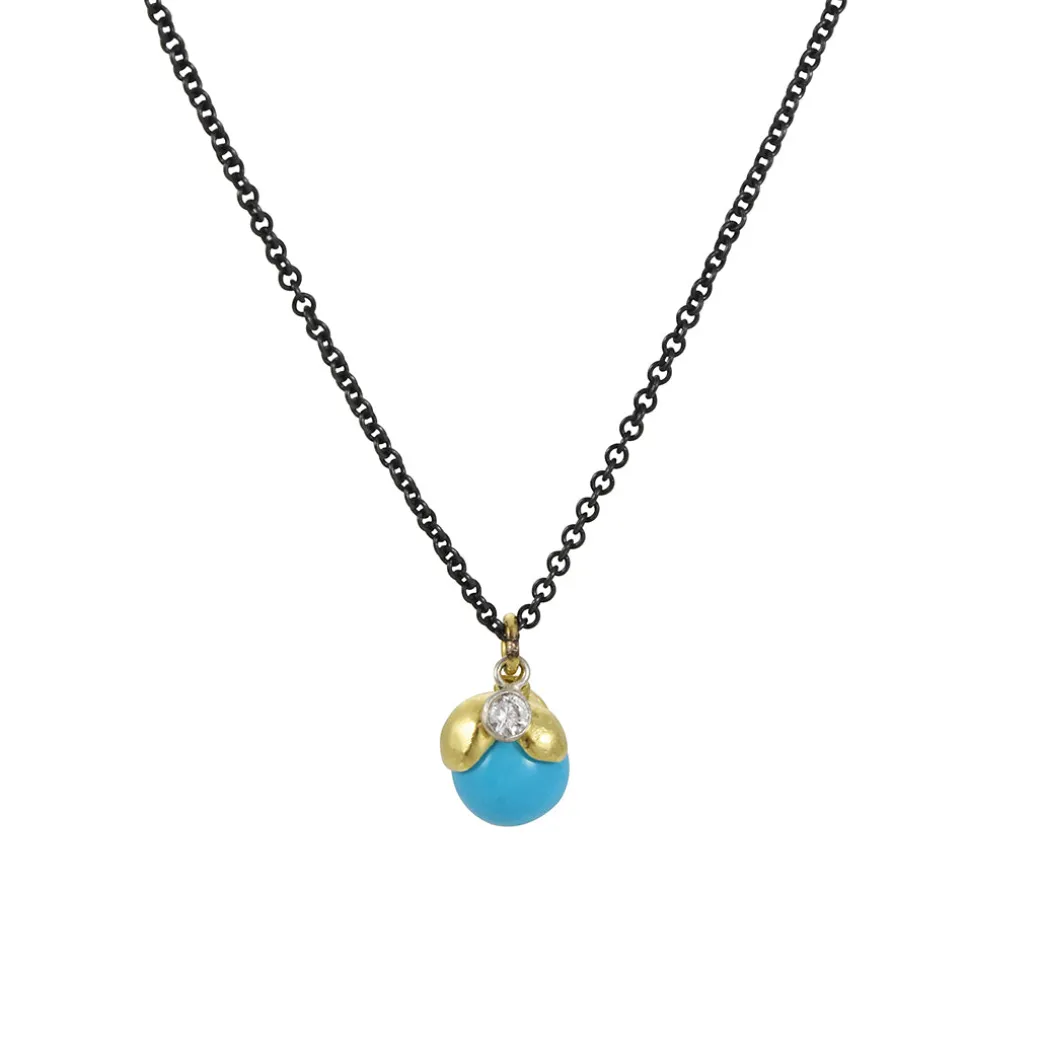This charming necklace features a lusterous turquoise with a botanical cap. A tiny white bezel set zircon completes it. Handmade in Sarah’s Marin County studio.