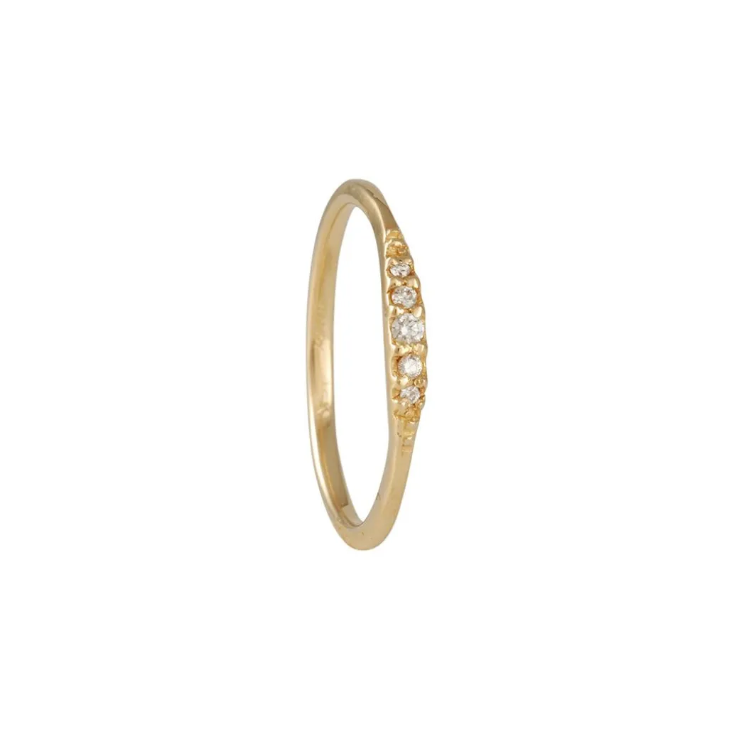 This sweet ring features five graduated diamonds set into an 14k yellow band. Great for stacking or to wear alone. Handmade in Shaesby’s Austin studio.