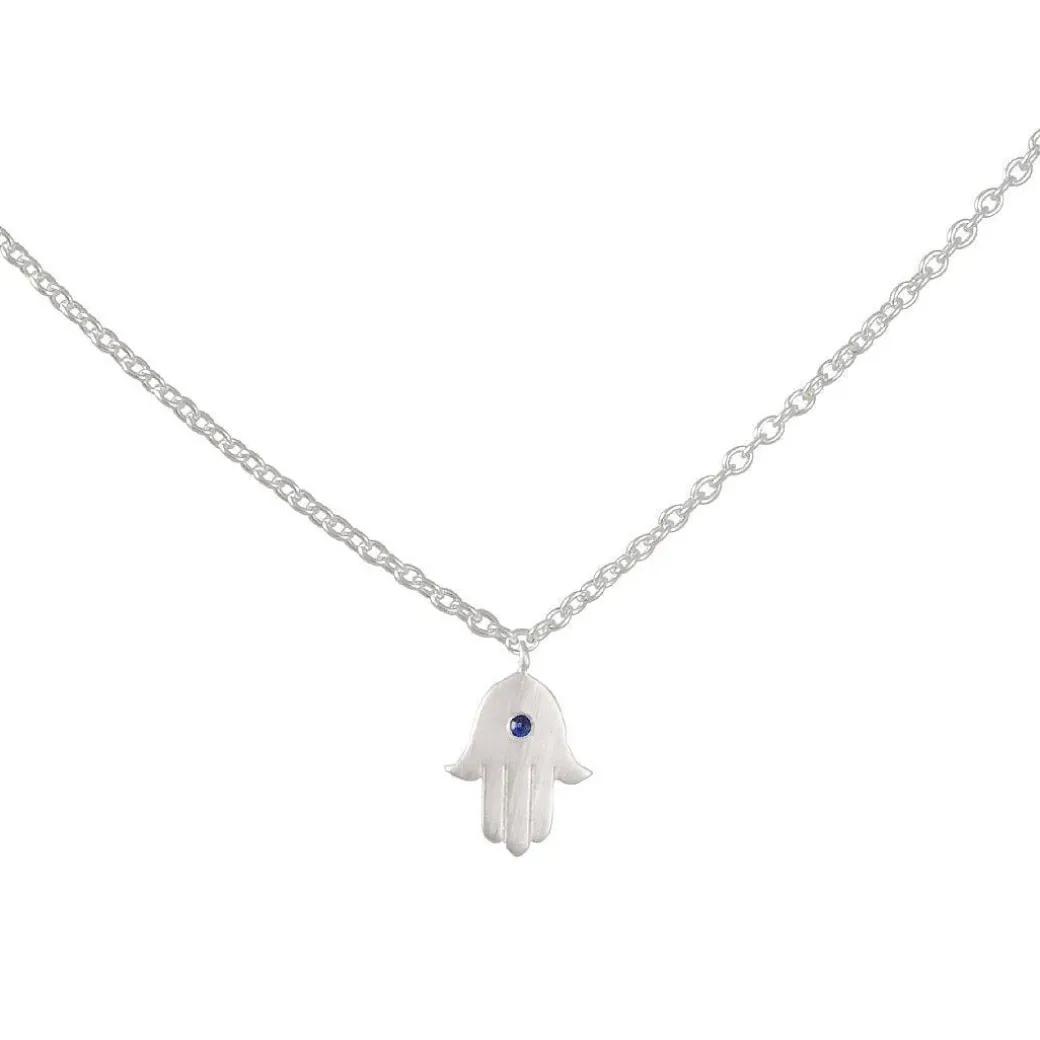 This protective necklace features a tiny Hamsa pendant with a single sapphire set in the palm.