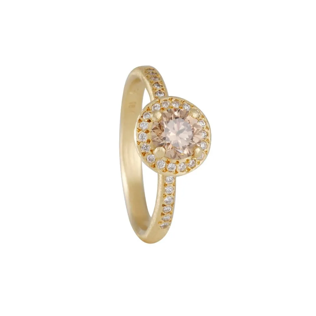 This stunning ring features a center champagne diamond with a pave white diamond halo. It features pave diamonds way around the satin finished band.