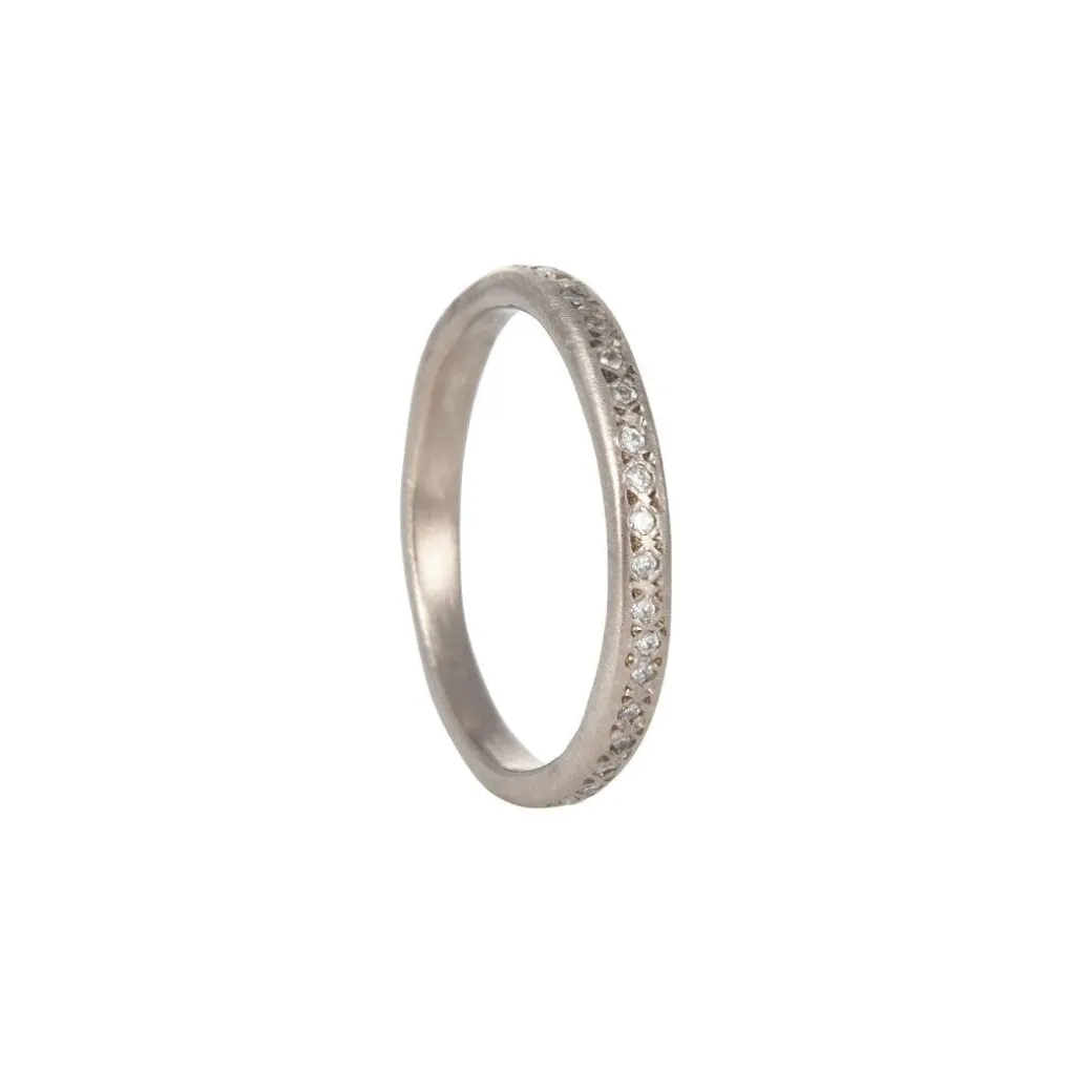 This stunning elegant sparking ring features a collection of diamonds set in beautiful palladium white gold. Could be a perfect wedding or engagement band or for adding a sparkle to a stack.