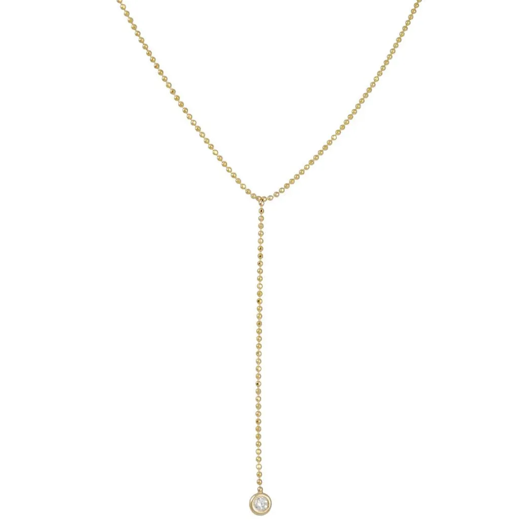 This delicate and edgy lariat necklace from Zoe Chicco features a super fine bead chain with a bezel set diamond at the end of the drop. This necklace is perfect for layering or as a subtle statement piece to be worn alone. Handcrafted in Zoe Chicco’s Los Angeles, CA workshop.