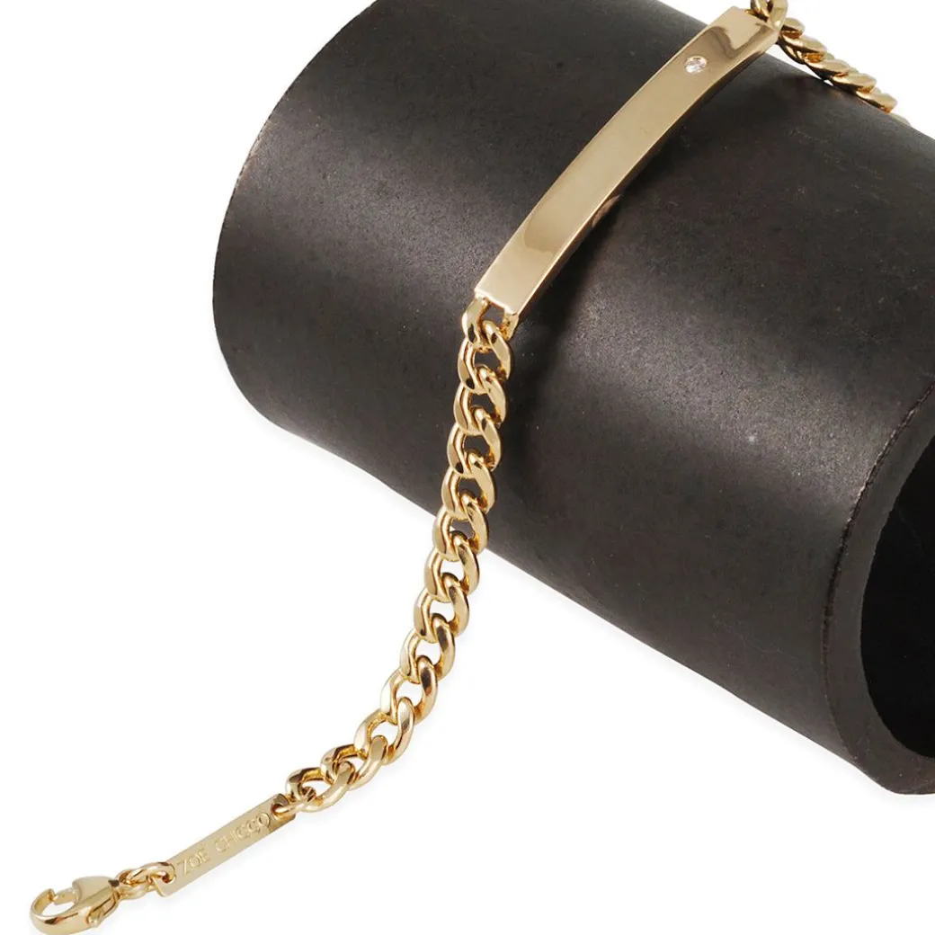 This classic ID bracelet set with a tiny diamond can be engraved. The smooth curb chain is comfortable against the skin and is finished with a secure lobster claw clasp.