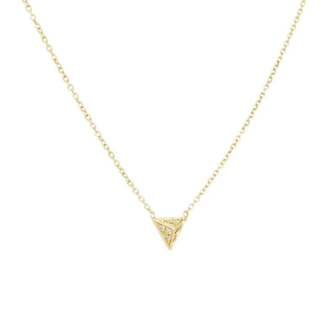 This little necklace features a pyramid pendant stationed on a simple cable chain. The pyramid is pave set with shimmering white diamonds.